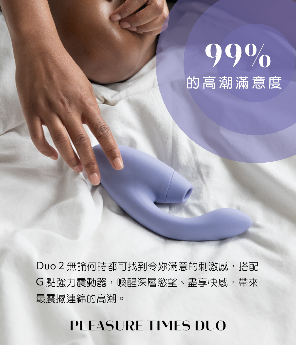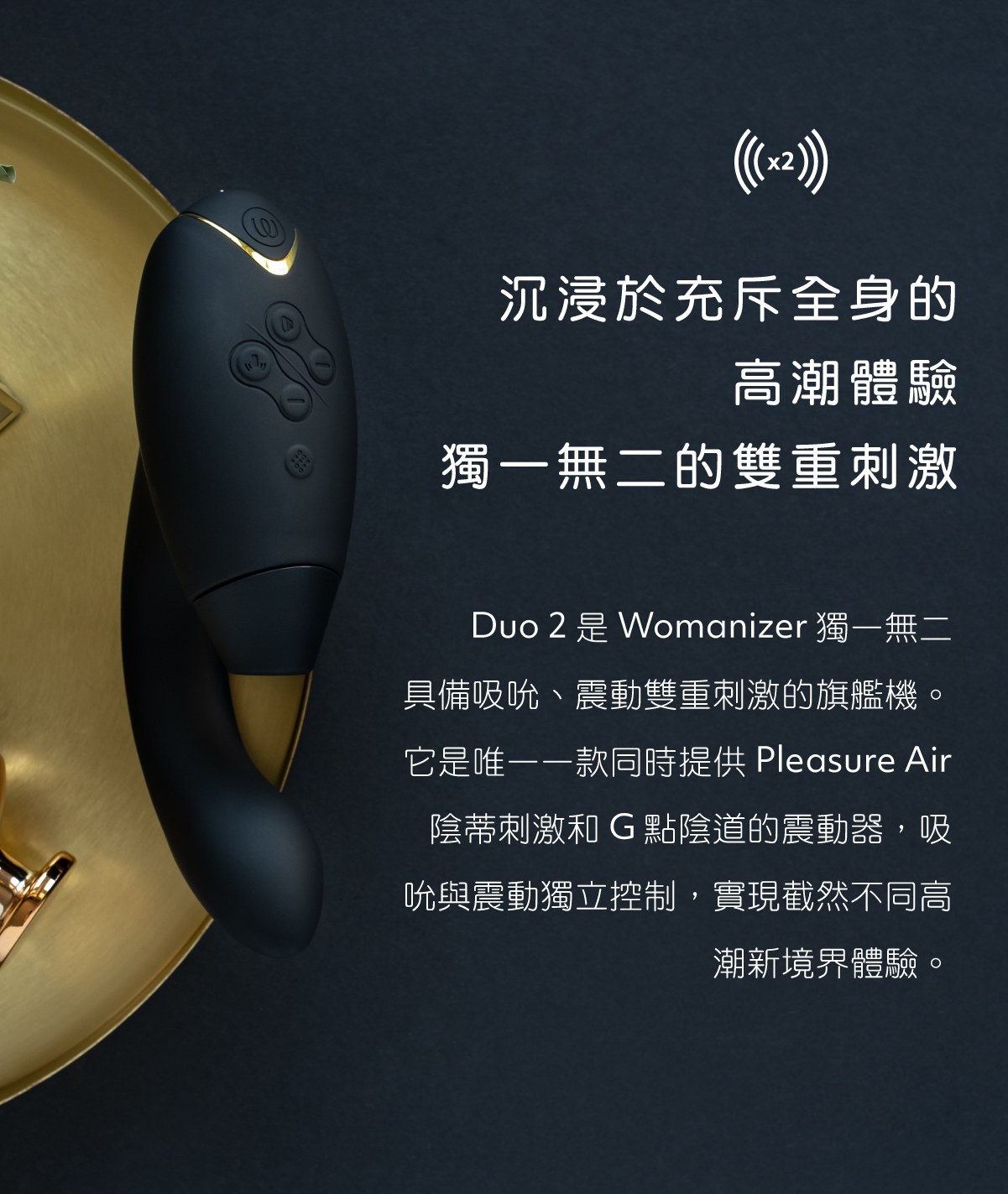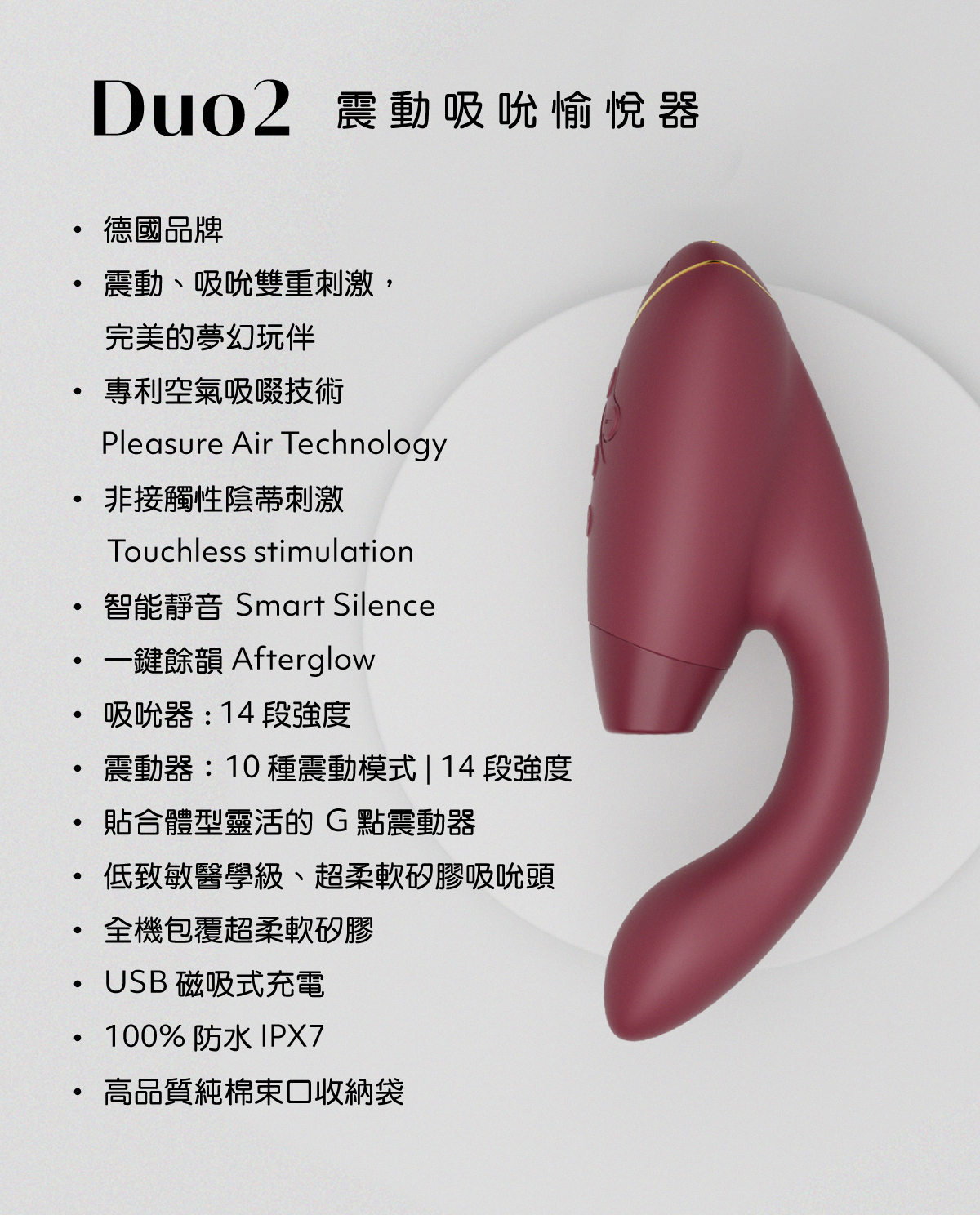 Duo 2 是 Womanizer 獨一無二具備吸吮、震動雙重刺激的旗艦機。它是唯一一款同時提供 Pleasure Air 陰蒂刺激和 G 點陰道的震動器,吸吮與震動獨立控制,實現截然不同高潮新境界體驗。