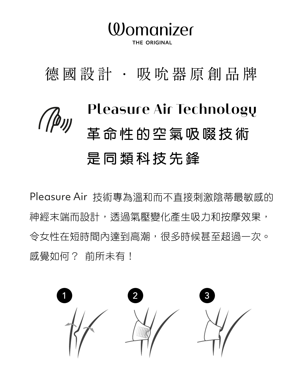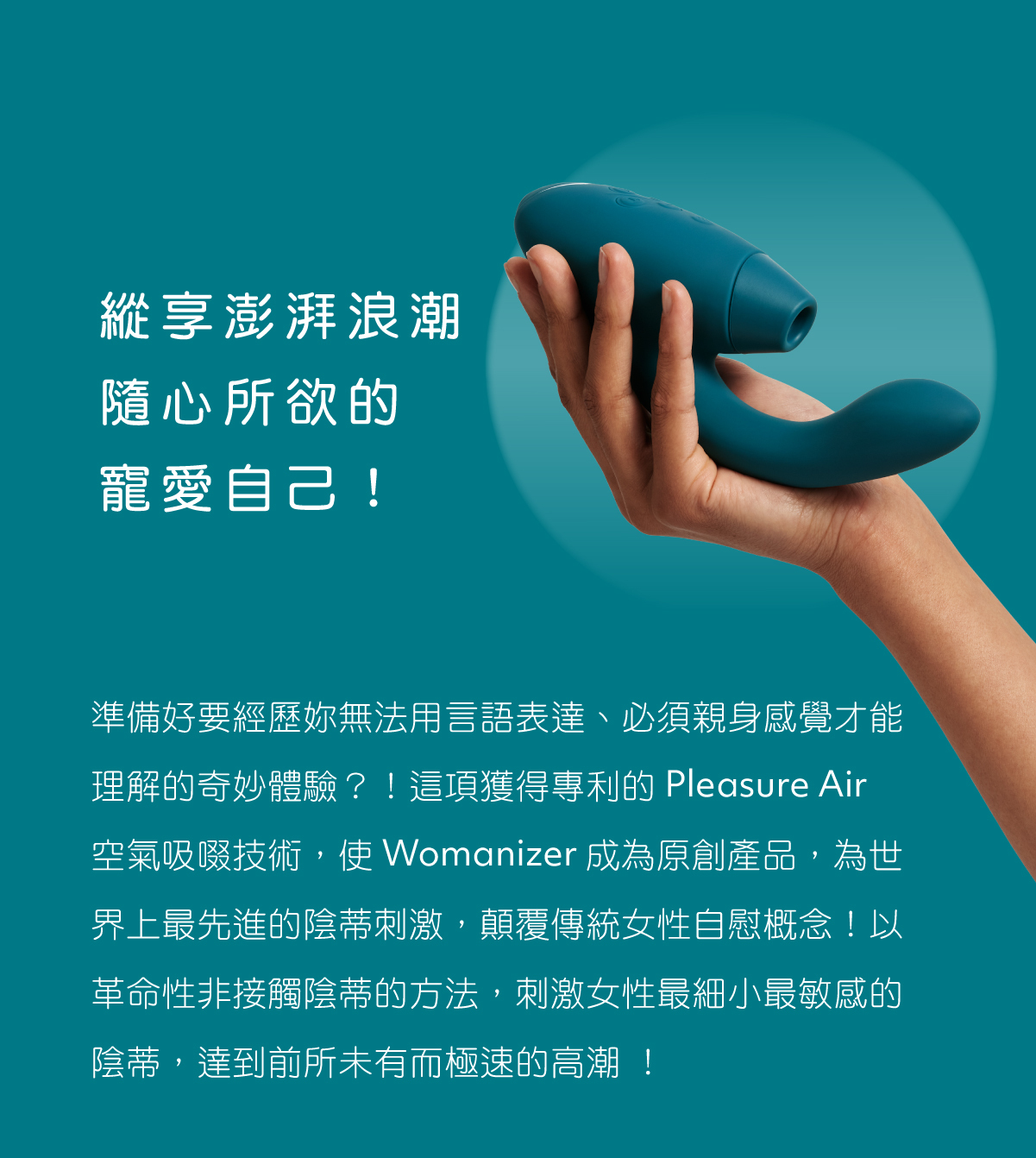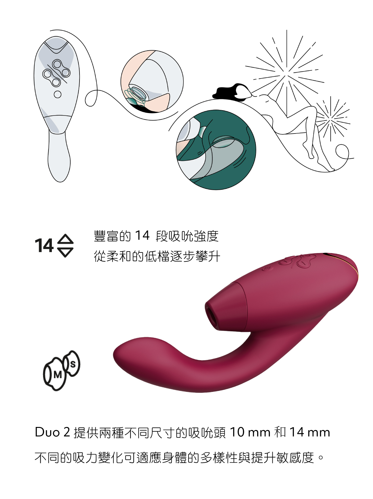 Duo 2 是 Womanizer 獨一無二具備吸吮、震動雙重刺激的旗艦機。它是唯一一款同時提供 Pleasure Air 陰蒂刺激和 G 點陰道的震動器,吸吮與震動獨立控制,實現截然不同高潮新境界體驗。
